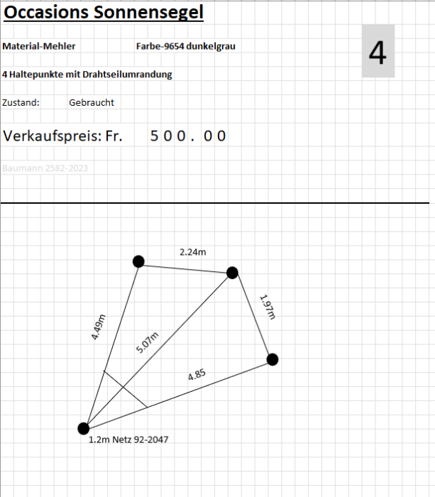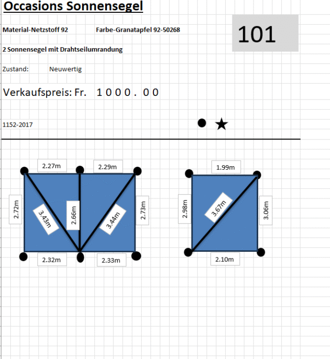 Occasion Sonnensegel Occasion Sonnensegel Für die korrekte Funktionsweise der Sonnensegel sind stabile Befestigungspunkte notwendig. Gerne beraten wir Sie bei der Installation und zeigen Ihnen die verschiedenen Stoffe. Interesse? Nehmen Sie mit uns Kontakt auf!
